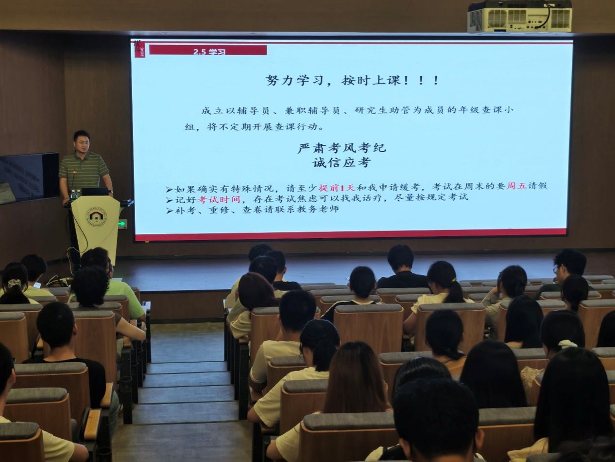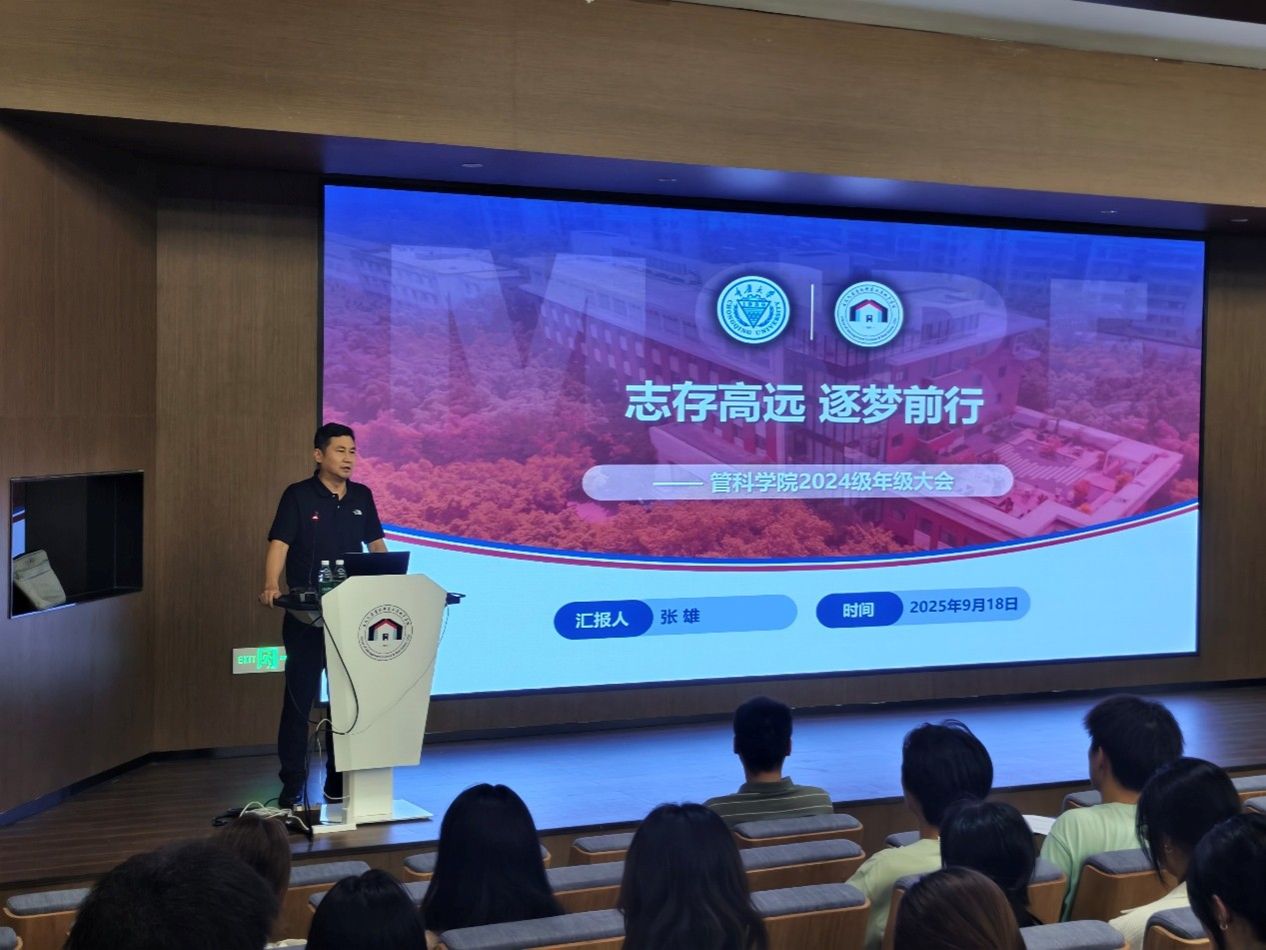2025年9月18日下午,重庆大学管理科学与房地产学院(以下简称“管科学院”)在学院105报告厅举行2024级本科生年级大会。学院党委副书记张雄及2024级全体本科生参加会议。本次会议由2024级辅导员梁原澍主持。