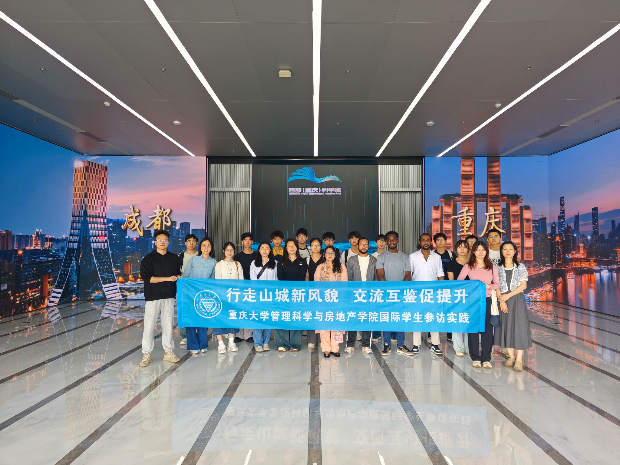 科学会堂中融合重庆山水意向的建筑风格与内部72米超大无柱空间令人惊叹,绿色循环系统、数字孪生与AI技术更让同学们切身领略到智能建筑的科技魅力。此次研学不仅拓宽了视野,更让同学们在亲身体验中感受到科技的澎湃动力。