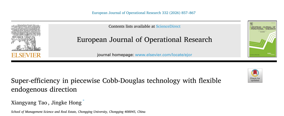近日,我院洪竞科教授团队在管理科学与运筹学领域顶级期刊《European Journal of Operational Research》上在线发表论文“Super-efficiency in piecewise Cobb-Douglas technology with flexible endogenous direction”(2026年332卷)。该期刊为ABS4星,FMS A类期刊。本研究由陶向阳助理研究员担任第一作者,洪竞科教授担任通讯作者。本研究获得国家自然科学基金项目(72401044, 72574033)、中国博士后科学基金面上项目(2023M740393)及博士后创新人才支持计划(GZC20233317)的资助。