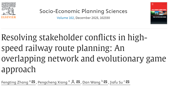 近日,我院向鹏成教授团队在《Socio-Economic Planning Sciences》上发表论文Resolving stakeholder conflicts in high-speed railway route planning: An overlapping network and evolutionary game approach(2025年09月)。该期刊为SSCI、SCI检索期刊,JCR一区、中科院一区top期刊,2024-2025年最新影响因子5.4,近5年平均影响因子5.3。本研究由向鹏成教授担任通讯作者和第二作者,我院博士生张凤婷为第一作者,合作者包括西安交通大学王丹博士(第三作者)、格乐大学苏加福教授(第四作者)。本研究获得国家社科基金西部项目(24XGL009)、重庆市社会科学规划重大项目(2023ZDSC12)和中央高校基本科研业务费(2024CDJSKXYGK11)的支持。