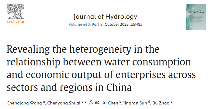 近日,我院帅晨阳团队在地球科学类学术期刊《Journal of Hydrology》发表论文“Revealing the heterogeneity in the relationship between water consumption and economic output of enterprises across sectors and regions in China”。该期刊系SCI检索期刊,JCR一区、中科院一区TOP期刊,最新影响因子6.3。我院硕士生王成龙为第一作者,帅晨阳副教授为通讯作者,合作者包括西南大学的陈曦副教授,南佛罗里达大学的孙景然助理教授和纽约州立大学的赵步助理教授。本研究得到了国家自然科学基金(52200209,52370192,52200221)的资助。