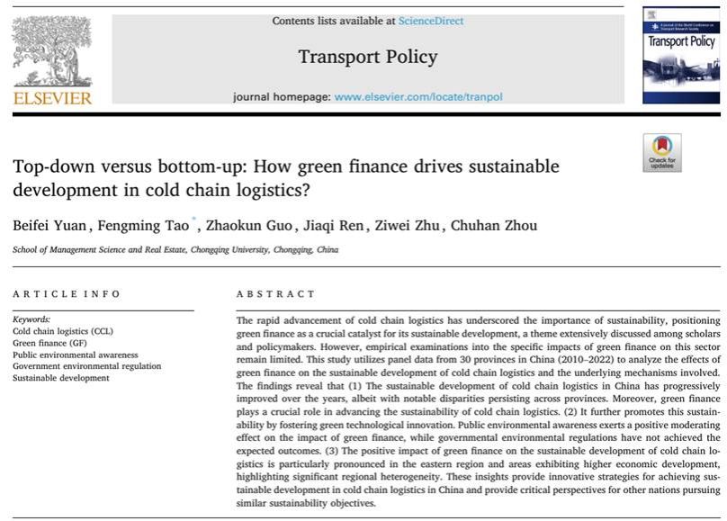 近日,我院陶凤鸣教授课题组在国际权威期刊Transport Policy上发表了题为Top-down versus bottom-up: How green finance drives sustainable development in cold chain logistics?(《自上而下还是自下而上:绿色金融如何驱动冷链物流可持续发展》)的学术论文。该期刊是SSCI检索Q1区期刊,影响因子达5.3,属于中科院一区Top期刊。